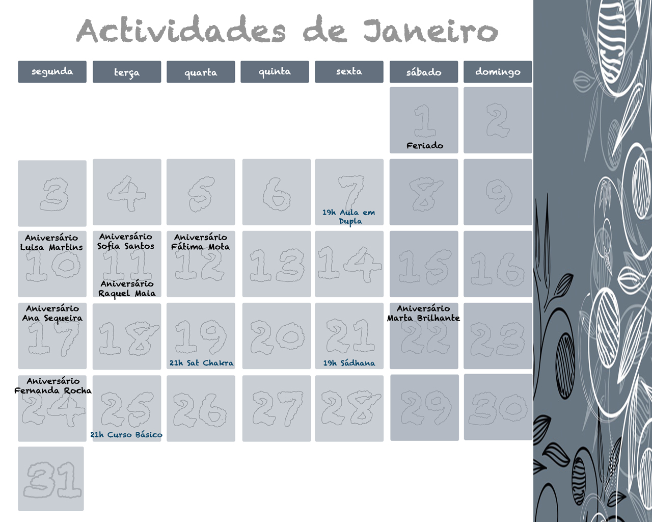 Calendário de Actividades de Janeiro